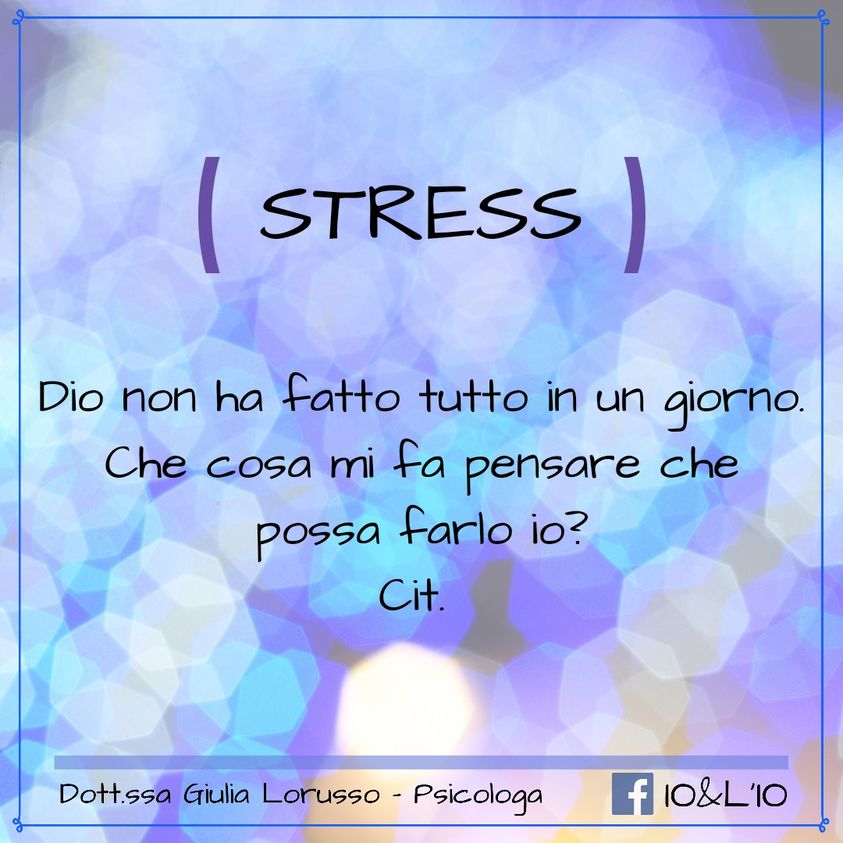 Che stress! Forse vi sarete sentiti stressati e, ahimè, impossibilitati a fare una pausa per via della vita frenetica e/o dei pensieri che affollano la mente. Facciamo chiarezza sull’argomento. Lo stress è un “messaggio” che l’ organismo ci invia (una sorta di allarme), qualora ritenesse che le risorse stiano scarseggiando e che, per tanto, non ce la farà a far fronte agli stimoli negativi a cui è sottoposto. Attenzione: non è il numero di stimoli a cui siete sottoposti che di per sé vi fa sentire stressati, ma l’idea di non riuscire a fronteggiarli per via delle scarse risorse! Quando si aziona l’allarme avvengono tutta una serie di modificazioni psico-fisiche che, in un primo momento, conducono l’individuo a resistere alla situazione stressante; se però tale condizione continua nel tempo il soggetto entrerà in una stato di esaurimento (esaurimento nervoso).Quando sentite che le risorse stanno scarseggiando, datevi retta. Prendetevi una pausa, fate il pieno di energie, riorganizzate le priorità!